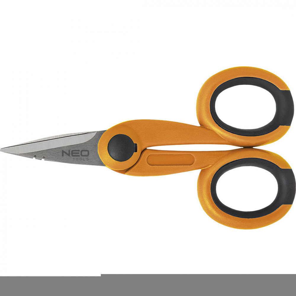Neo kábelvágó és blankoló olló, 140 mm-es, élhossza 45 mm. A lézeresen fogazott élek megakadályozzák a vágott anyag kicsúszását. Két bevágással a 0,7 mm² és az 1,0 mm²-es vezetékek csupaszolásához. Az ergonómikus bimateriál markolat növeli a használat komfortját.