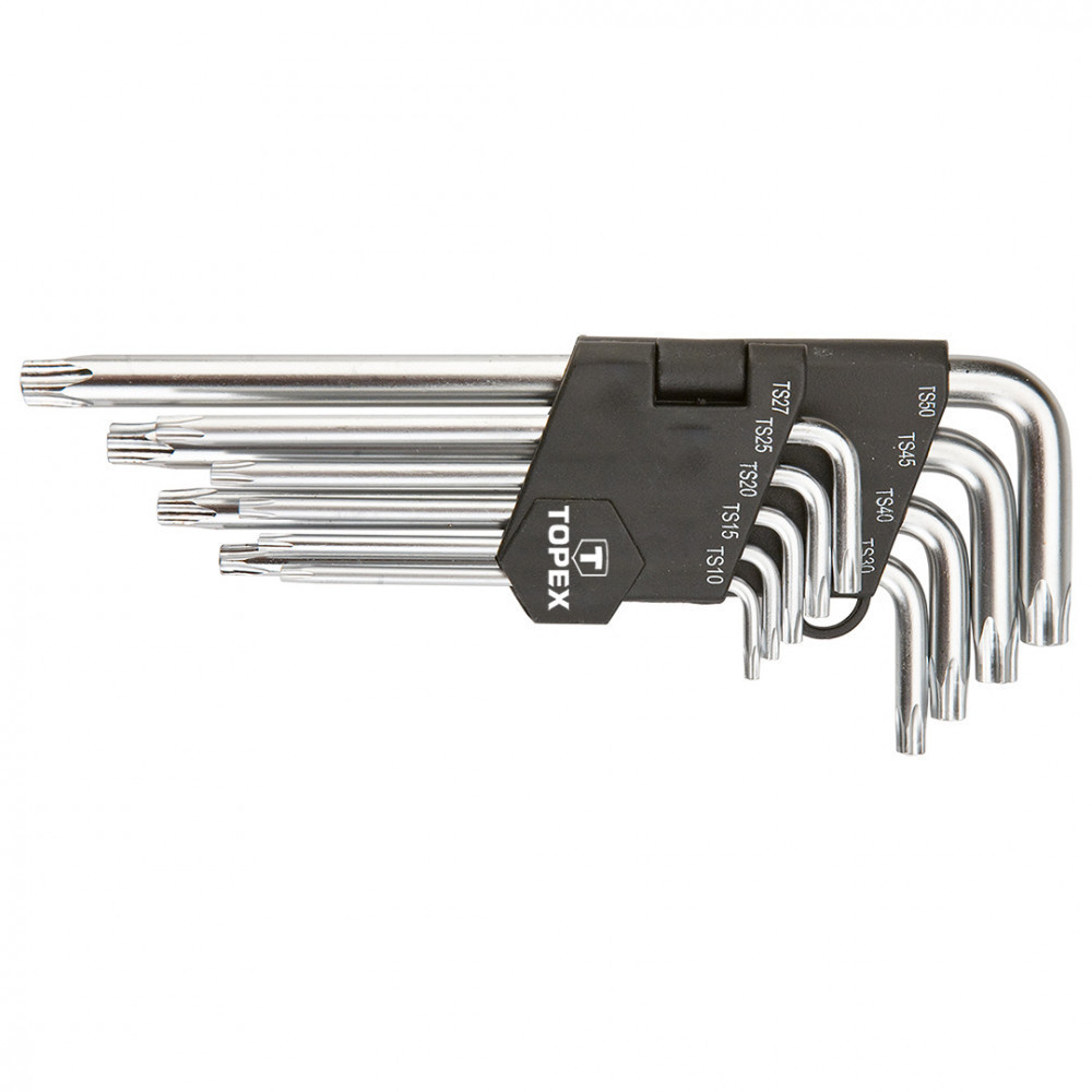 Topex hosszú ötlapú Torx kulcsok TS 10 - TS 50 méretekben. Nagy ellenállóképességű, a terméknek hosszú élettartamot biztosító króm-vanádium acélból készülnek. A praktikus, mindegyik kulcsnak külön rekesszel rendelkező műanyag csomagolás megkönnyíti a tárolásukat.