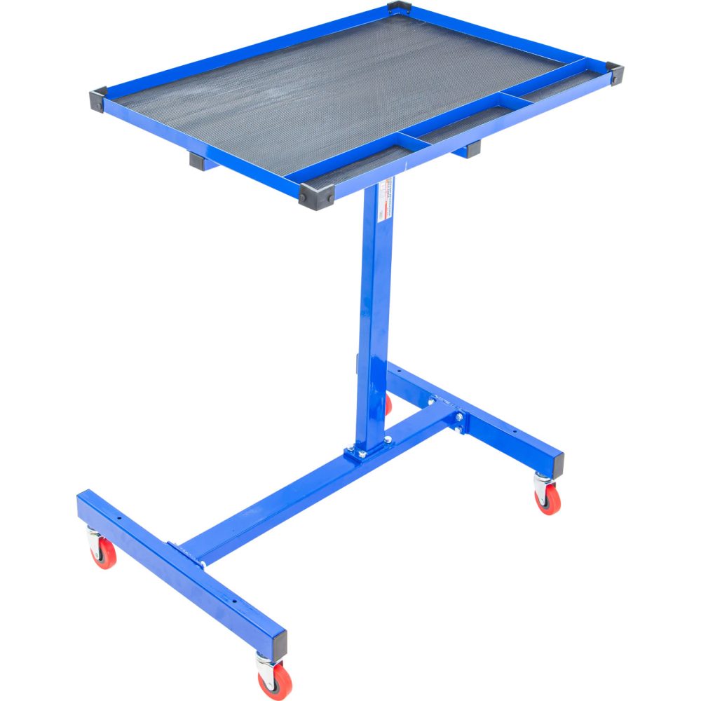 Gurulós asztal. Méretek: 754 x 515 mm. A magasság teleszkópos, négyszög keresztmetszetű csővel állítható 880–1180 mm között. 1 nagy tároló belső méretei: 730 x 430 x 20 mm. 3 tárolórekesz belső méretei: 240 x 70 x 20 mm. 4 vezető görgő, Ø 60 mm. Maximális teherbírás: 23 kg.