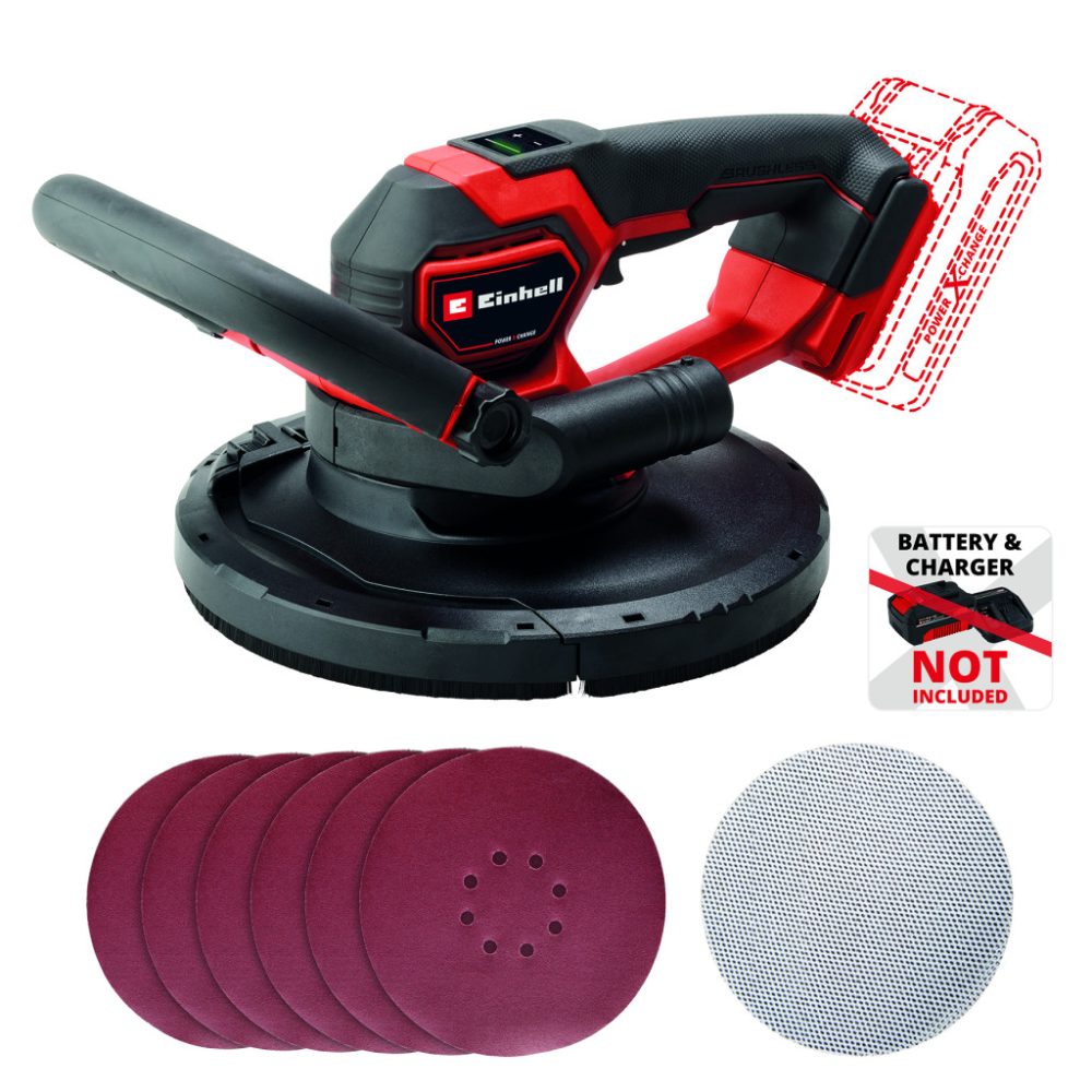 Az Einhell TP-DWS 18/225 Li BL Solo profi akkumulátoros gipszkartoncsiszoló a Power X-Change rendszercsalád nagy teljesítményű, 18 V Einhell PurePOWER Brushless (szénkefe nélküli) motorral felszerelt tagja. A szénkefe nélküli motorok nagyobb erőátvitelt és hosszabb üzemidőt garantálnak, mint a szénkefével gyártott társaik. A szénkefe nélküli motorokra – online regisztrációt követően – 10 év jótállást vállalunk. A készülék segítségével simára csiszolhatja a gipszkartonfelületeket, és eltávolíthatja a tömítőanyag- vagy tapétamaradványokat. A fordulatszám-szabályozó elektronika lehetővé teszi, hogy a csiszolótányér forgását mindig az alkalmazási terület és a megmunkálandó felület tulajdonságainak megfelelően állíthassa be. A rögzíthető kapcsológomb használatával folyamatosan is üzemeltetheti a készüléket. A 2,4 kg-os kialakítás és a Softgrip borítású fő- és pótfogantyúk rendkívül kényelmes és biztonságos munkavégzést tesznek lehetővé. A beépített porelszívó funkció segít a munkaterület tisztán tartásában. Az elszívó a 35 mm átmérőjű adapter és a 4,5 m hosszú elszívótömlő segítségével csatlakoztatható a hevederrel ellátott porgyűjtő zsákhoz. A kefegyűrű levehető a rugós felfüggesztésű csiszolótányérról, ami így mindig felfekszik a megmunkálandó felületre. A gyári csomagolás 6 darab különböző szemcseméretű (2x P60, P80, P120, Ø 225 mm) csiszolópapírt és egy rácsos lenanyag csiszolót tartalmaz, amelyet a tépőzár segítségével gyorsan és egyszerűen a csiszolótányérra rögzíthet. Akku és töltő nélkül. Ezeket külön vásárolhatja meg.