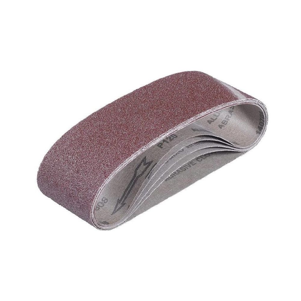 5 darabos csiszolószalag-készlet különböző szemcseméretekkel. Fa és fém hatékony megmunkálásához. Csiszolószalag szemcseméretek: 2xP40, 2xP80, 1xP120, Méretek: 75 x 533 mm